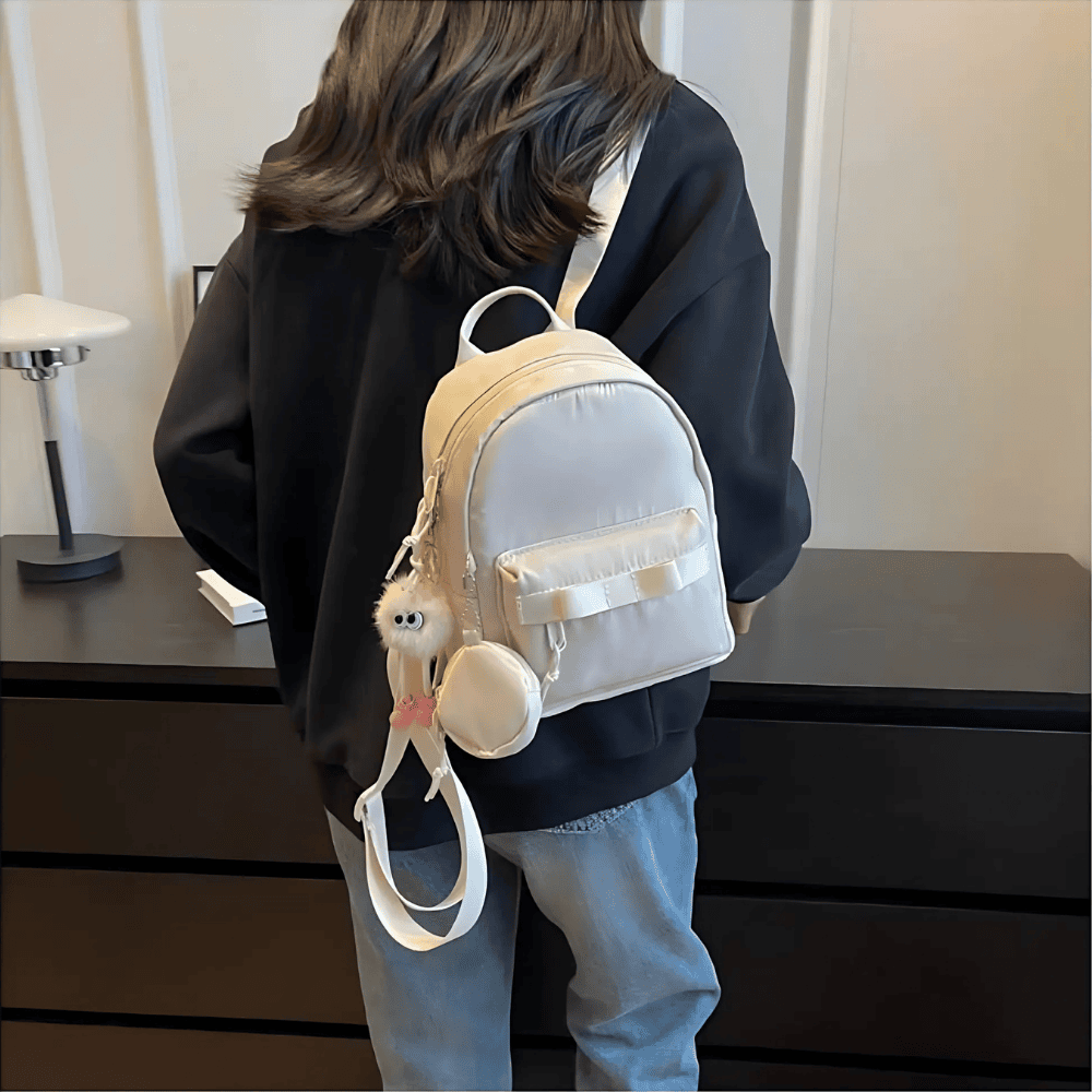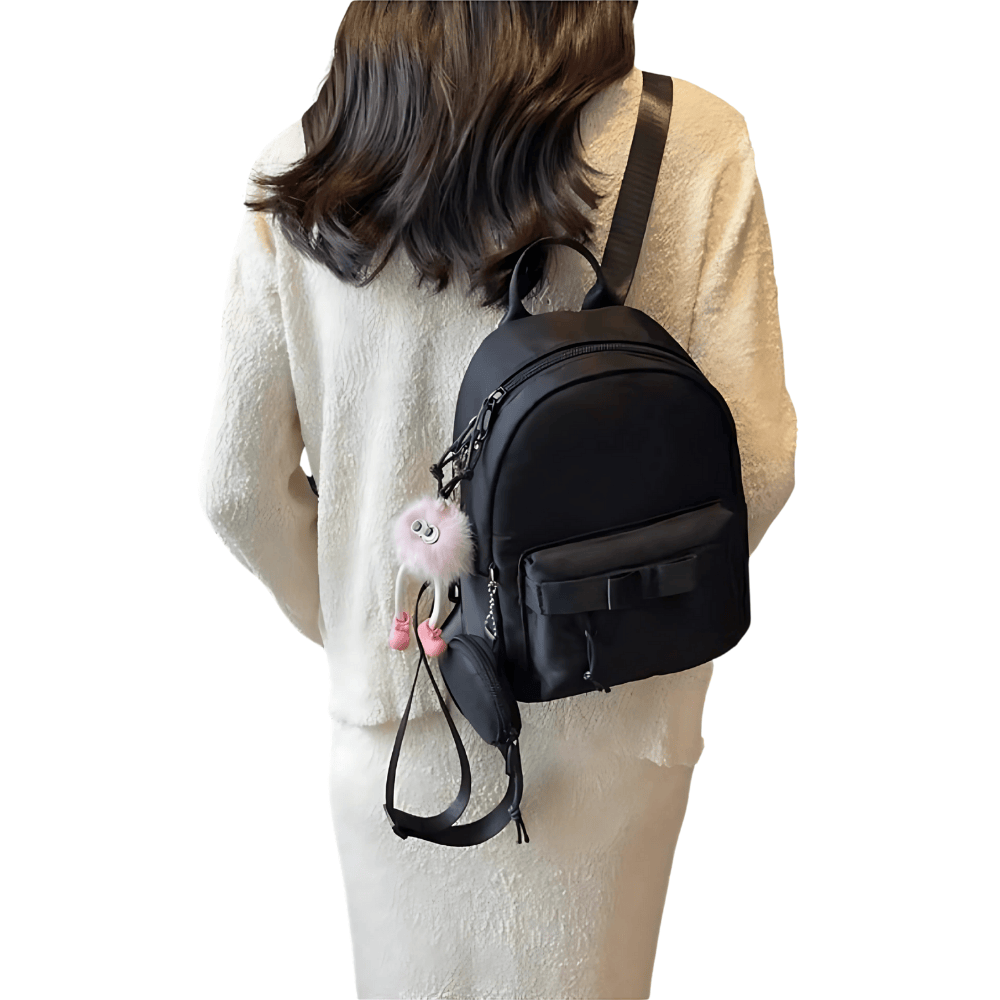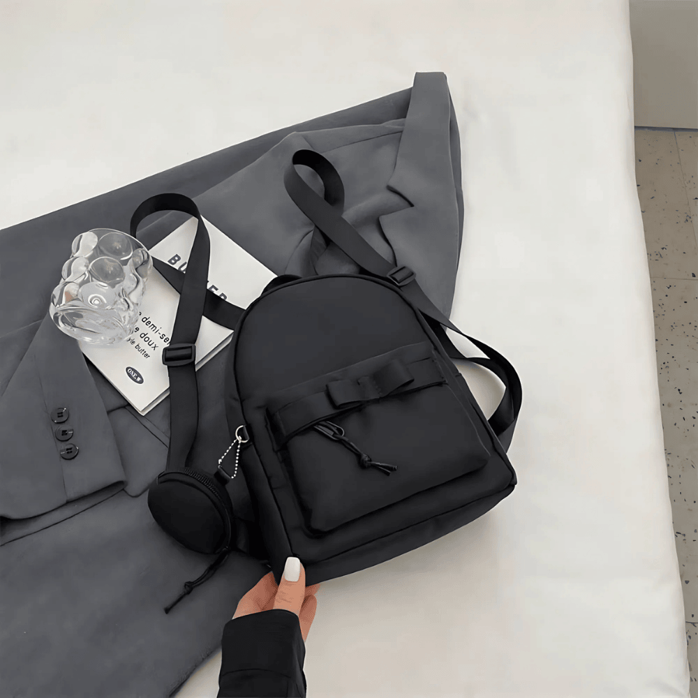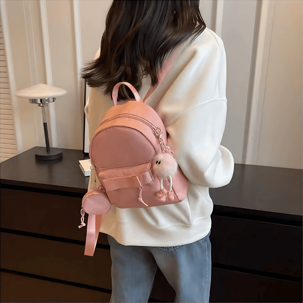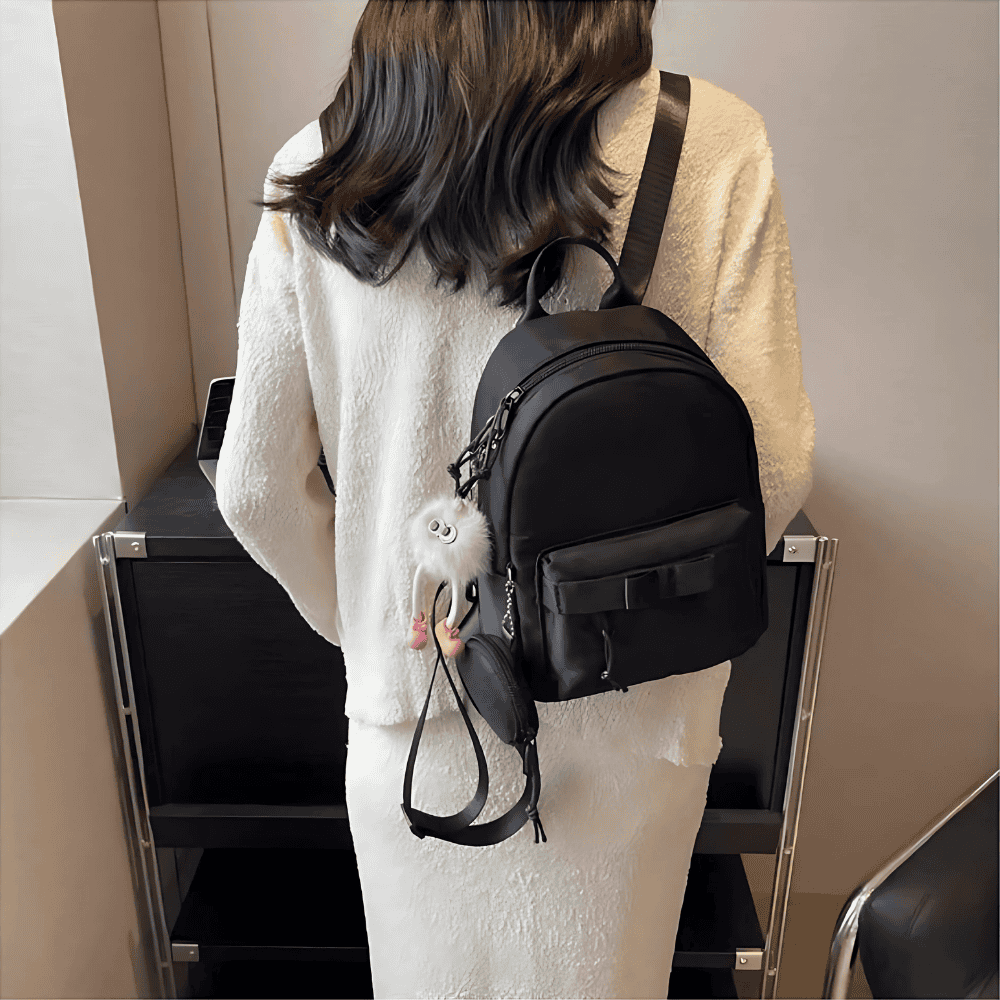Denna kompakta och trendiga ryggsäck är perfekt för kvinnor och tonåringar som vill kombinera stil och funktionalitet. Tillverkad i slitstark polyester med mjuk finish, designad med en elegant rosett och praktiskt hörlursfack. Perfekt för kortare utflykter, vardag, shopping eller skoldagar. Den finns i färgerna svart, beige och rosa – välj din favorit!
