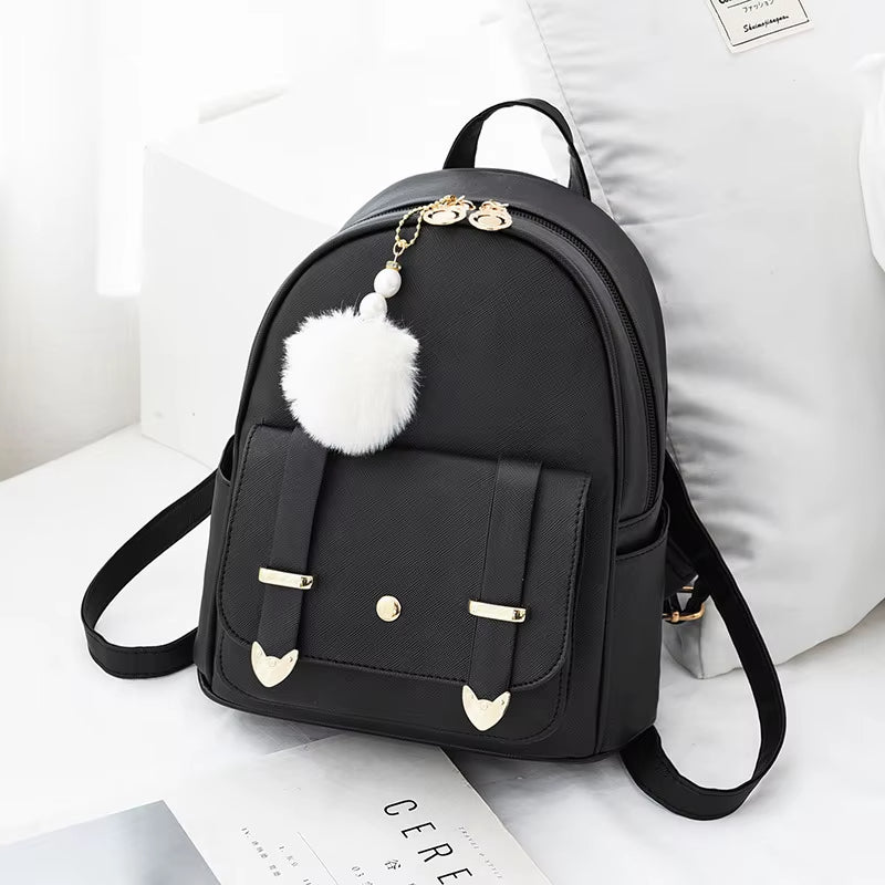 Denna kompakta och eleganta ryggsäck kombinerar stil och funktion i ett lätt PU-lädermaterial. Med guldiga detaljer, dekorativ pom-pom och en praktisk ficka på framsidan är den perfekt för både skolbruk och vardag. Passar tonårstjejer och unga kvinnor som vill ha en snygg, funktionell och lättanvänd ryggsäck för shopping, fritid eller kortare utflykter.