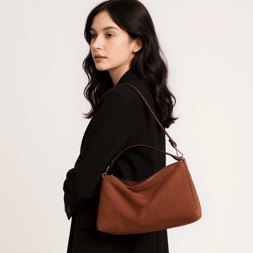 Denna stilrena axelväska kombinerar funktionalitet med en tidlös retrodesign. Tillverkad i slitstarkt och lätt PU-läder med en texturerad mocka-liknande yta, är den perfekt för både vardag och pendling. Väskan har en bekväm axelrem samt ett kortare handtag som gör den flexibel att bära både i handen eller över axeln. Den kompakta men rymliga designen gör den till en utmärkt följeslagare för arbete, shopping och stadsliv.
